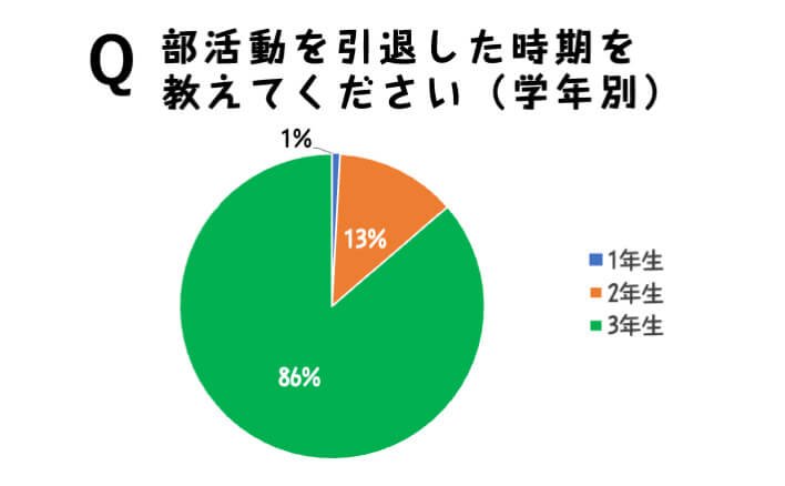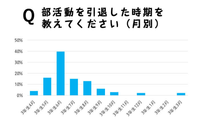 さらに、高3で引退した人の具体的な引退月を見ると、最も多かったのが「6月」で約4割、次いで「5月」が約16%、「7月」が約15%、「8月」が約13%でした。運動部を中心に、夏のインターハイ予選や地区大会が区切りとなって引退するケースが多いことがわかります。