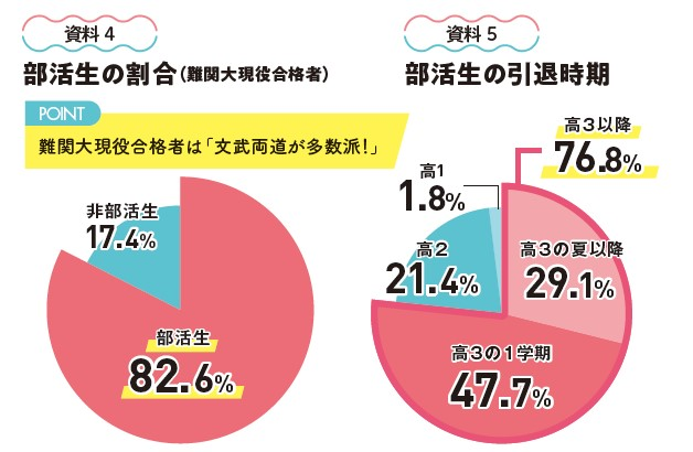 このデータは非常に重要です。「部活を早く辞めないと難関大に受からない」という印象を持っている保護者は少なくありませんが、実際には難関大現役合格者の7割以上が高3まで部活を続けているのです。