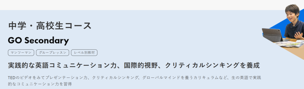 プリスクール年長・卒業後に日本語環境で学校教育を受けている方向け。 - GO インターナショナル:帰国子女、インターナショナル通学者、留学・海外進学を目指す英語上級者向け。