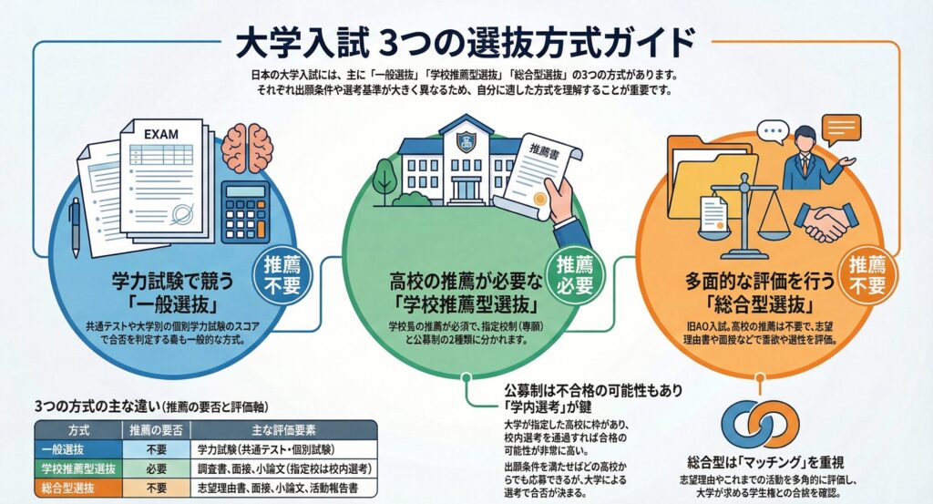 大学入試は大きく3つの方式に分かれます。ここで重要なのは、「指定校推薦」は独立した方式ではなく、「学校推薦型選抜」の中の一種だという点です。混乱しやすい部分なので、関係を整理しておきます。